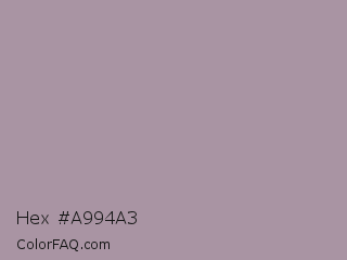 Hex #a994a3 Color is a light magenta color and the nearest color is Heliotrope Gray #aa98a9. Hex code #a994a3 and RGB value is rgb(169,148,163). In RGB color space, this color is composed of 66% red, 58% green, 64% blue, In CMYK color space, this color is composed of 0% cyan, 12% magenta, 4% yellow , 34% black , In HSL color space, this color has a hue angle of 317° , 11% saturation and 62% lightness.