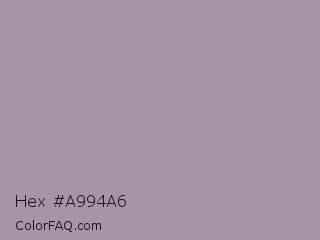 Hex #a994a6 Color is a light magenta color and the nearest color is Heliotrope Gray #aa98a9. Hex code #a994a6 and RGB value is rgb(169,148,166). In RGB color space, this color is composed of 66% red, 58% green, 65% blue, In CMYK color space, this color is composed of 0% cyan, 12% magenta, 2% yellow , 34% black , In HSL color space, this color has a hue angle of 309° , 11% saturation and 62% lightness.