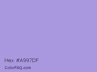 Hex #a997df Color is a light indigo color and the nearest color is Dull Lavender #a899e6. Hex code #a997df and RGB value is rgb(169,151,223). In RGB color space, this color is composed of 66% red, 59% green, 87% blue, In CMYK color space, this color is composed of 24% cyan, 32% magenta, 0% yellow , 13% black , In HSL color space, this color has a hue angle of 255° , 53% saturation and 73% lightness.