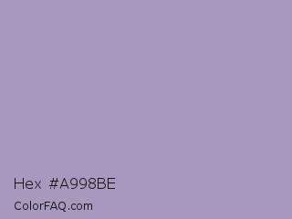 Hex #a998be Color is a light violet color and the nearest color is Amethyst Smoke #a397b4. Hex code #a998be and RGB value is rgb(169,152,190). In RGB color space, this color is composed of 66% red, 60% green, 75% blue, In CMYK color space, this color is composed of 11% cyan, 20% magenta, 0% yellow , 25% black , In HSL color space, this color has a hue angle of 267° , 23% saturation and 67% lightness.