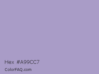 Hex #a99cc7 Color is a light indigo color and the nearest color is Blue Bell #a2a2d0. Hex code #a99cc7 and RGB value is rgb(169,156,199). In RGB color space, this color is composed of 66% red, 61% green, 78% blue, In CMYK color space, this color is composed of 15% cyan, 22% magenta, 0% yellow , 22% black , In HSL color space, this color has a hue angle of 258° , 28% saturation and 70% lightness.