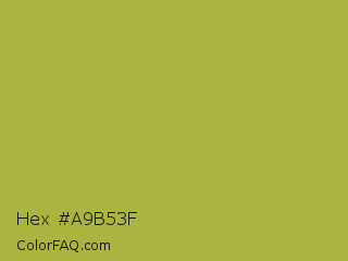 Hex #a9b53f Color is a normal yellow color and the nearest color is Android Green #a4c639. Hex code #a9b53f and RGB value is rgb(169,181,63). In RGB color space, this color is composed of 66% red, 71% green, 25% blue, In CMYK color space, this color is composed of 7% cyan, 0% magenta, 65% yellow , 29% black , In HSL color space, this color has a hue angle of 66° , 48% saturation and 48% lightness.