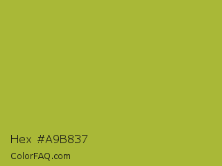 Hex #a9b837 Color is a normal yellow color and the nearest color is Android Green #a4c639. Hex code #a9b837 and RGB value is rgb(169,184,55). In RGB color space, this color is composed of 66% red, 72% green, 22% blue, In CMYK color space, this color is composed of 8% cyan, 0% magenta, 70% yellow , 28% black , In HSL color space, this color has a hue angle of 67° , 54% saturation and 47% lightness.