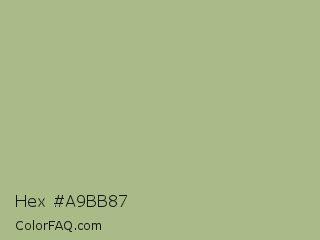 Hex #a9bb87 Color is a light green color and the nearest color is Swamp Green #acb78e. Hex code #a9bb87 and RGB value is rgb(169,187,135). In RGB color space, this color is composed of 66% red, 73% green, 53% blue, In CMYK color space, this color is composed of 10% cyan, 0% magenta, 28% yellow , 27% black , In HSL color space, this color has a hue angle of 81° , 28% saturation and 63% lightness.