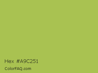 Hex #a9c251 Color is a normal lime color and the nearest color is Middle Green Yellow #acbf60. Hex code #a9c251 and RGB value is rgb(169,194,81). In RGB color space, this color is composed of 66% red, 76% green, 32% blue, In CMYK color space, this color is composed of 13% cyan, 0% magenta, 58% yellow , 24% black , In HSL color space, this color has a hue angle of 73° , 48% saturation and 54% lightness.
