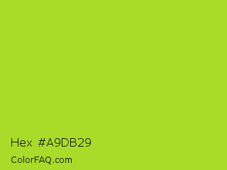 Hex #a9db29 Color is a normal lime color and the nearest color is Yellow Green #9acd32. Hex code #a9db29 and RGB value is rgb(169,219,41). In RGB color space, this color is composed of 66% red, 86% green, 16% blue, In CMYK color space, this color is composed of 23% cyan, 0% magenta, 81% yellow , 14% black , In HSL color space, this color has a hue angle of 77° , 71% saturation and 51% lightness.