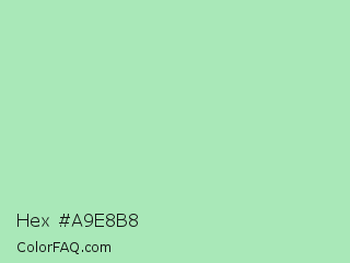 Hex #a9e8b8 Color is a light green color and the nearest color is Chinook #a8e3bd. Hex code #a9e8b8 and RGB value is rgb(169,232,184). In RGB color space, this color is composed of 66% red, 91% green, 72% blue, In CMYK color space, this color is composed of 27% cyan, 0% magenta, 21% yellow , 9% black , In HSL color space, this color has a hue angle of 134° , 58% saturation and 79% lightness.