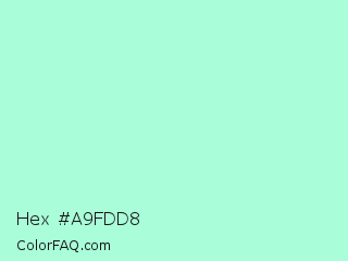 Hex #a9fdd8 Color is a very light green color and the nearest color is Magic Mint #aaf0d1. Hex code #a9fdd8 and RGB value is rgb(169,253,216). In RGB color space, this color is composed of 66% red, 99% green, 85% blue, In CMYK color space, this color is composed of 33% cyan, 0% magenta, 15% yellow , 1% black , In HSL color space, this color has a hue angle of 154° , 95% saturation and 83% lightness.