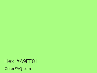Hex #a9fe81 Color is a light green color and the nearest color is Sulu #c1f07c. Hex code #a9fe81 and RGB value is rgb(169,254,129). In RGB color space, this color is composed of 66% red, 100% green, 51% blue, In CMYK color space, this color is composed of 33% cyan, 0% magenta, 49% yellow , 0% black , In HSL color space, this color has a hue angle of 101° , 98% saturation and 75% lightness.