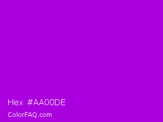 Hex #aa00de Color is a normal purple color and the nearest color is Vivid Mulberry #b80ce3. Hex code #aa00de and RGB value is rgb(170,0,222). In RGB color space, this color is composed of 67% red, 0% green, 87% blue, In CMYK color space, this color is composed of 23% cyan, 100% magenta, 0% yellow , 13% black , In HSL color space, this color has a hue angle of 286° , 100% saturation and 44% lightness.