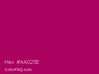 Hex #aa025e Color is a normal magenta color and the nearest color is Lipstick #ab0563. Hex code #aa025e and RGB value is rgb(170,2,94). In RGB color space, this color is composed of 67% red, 1% green, 37% blue, In CMYK color space, this color is composed of 0% cyan, 99% magenta, 45% yellow , 33% black , In HSL color space, this color has a hue angle of 327° , 98% saturation and 34% lightness.