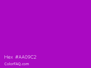 Hex #aa09c2 Color is a normal magenta color and the nearest color is Heliotrope Magenta #aa00bb. Hex code #aa09c2 and RGB value is rgb(170,9,194). In RGB color space, this color is composed of 67% red, 4% green, 76% blue, In CMYK color space, this color is composed of 12% cyan, 95% magenta, 0% yellow , 24% black , In HSL color space, this color has a hue angle of 292° , 91% saturation and 40% lightness.