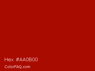 Hex #aa0b00 Color is a normal red color and the nearest color is Mordant Red 19 #ae0c00. Hex code #aa0b00 and RGB value is rgb(170,11,0). In RGB color space, this color is composed of 67% red, 4% green, 0% blue, In CMYK color space, this color is composed of 0% cyan, 94% magenta, 100% yellow , 33% black , In HSL color space, this color has a hue angle of 4° , 100% saturation and 33% lightness.