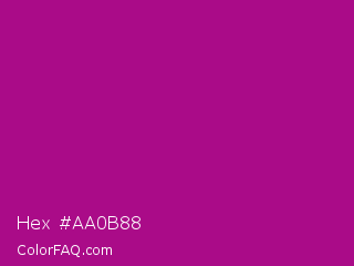 Hex #aa0b88 Color is a normal magenta color and the nearest color is Violet Eggplant #991199. Hex code #aa0b88 and RGB value is rgb(170,11,136). In RGB color space, this color is composed of 67% red, 4% green, 53% blue, In CMYK color space, this color is composed of 0% cyan, 94% magenta, 20% yellow , 33% black , In HSL color space, this color has a hue angle of 313° , 88% saturation and 35% lightness.