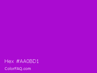 Hex #aa0bd1 Color is a normal purple color and the nearest color is Purple Munsell #9f00c5. Hex code #aa0bd1 and RGB value is rgb(170,11,209). In RGB color space, this color is composed of 67% red, 4% green, 82% blue, In CMYK color space, this color is composed of 19% cyan, 95% magenta, 0% yellow , 18% black , In HSL color space, this color has a hue angle of 288° , 90% saturation and 43% lightness.