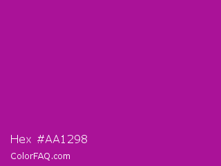 Hex #aa1298 Color is a normal magenta color and the nearest color is Violet Eggplant #991199. Hex code #aa1298 and RGB value is rgb(170,18,152). In RGB color space, this color is composed of 67% red, 7% green, 60% blue, In CMYK color space, this color is composed of 0% cyan, 89% magenta, 11% yellow , 33% black , In HSL color space, this color has a hue angle of 307° , 81% saturation and 37% lightness.