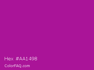 Hex #aa1498 Color is a normal magenta color and the nearest color is Violet Eggplant #991199. Hex code #aa1498 and RGB value is rgb(170,20,152). In RGB color space, this color is composed of 67% red, 8% green, 60% blue, In CMYK color space, this color is composed of 0% cyan, 88% magenta, 11% yellow , 33% black , In HSL color space, this color has a hue angle of 307° , 79% saturation and 37% lightness.