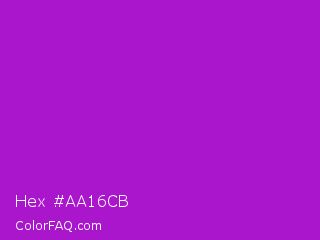 Hex #aa16cb Color is a normal purple color and the nearest color is Purple Munsell #9f00c5. Hex code #aa16cb and RGB value is rgb(170,22,203). In RGB color space, this color is composed of 67% red, 9% green, 80% blue, In CMYK color space, this color is composed of 16% cyan, 89% magenta, 0% yellow , 20% black , In HSL color space, this color has a hue angle of 289° , 80% saturation and 44% lightness.
