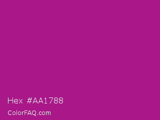Hex #aa1788 Color is a normal magenta color and the nearest color is Violet Eggplant #991199. Hex code #aa1788 and RGB value is rgb(170,23,136). In RGB color space, this color is composed of 67% red, 9% green, 53% blue, In CMYK color space, this color is composed of 0% cyan, 86% magenta, 20% yellow , 33% black , In HSL color space, this color has a hue angle of 314° , 76% saturation and 38% lightness.