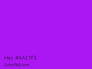Hex #aa17f3 Color is a normal purple color and the nearest color is Veronica #a020f0. Hex code #aa17f3 and RGB value is rgb(170,23,243). In RGB color space, this color is composed of 67% red, 9% green, 95% blue, In CMYK color space, this color is composed of 30% cyan, 91% magenta, 0% yellow , 5% black , In HSL color space, this color has a hue angle of 280° , 90% saturation and 52% lightness.