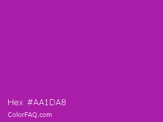 Hex #aa1da8 Color is a normal magenta color and the nearest color is Violet Eggplant #991199. Hex code #aa1da8 and RGB value is rgb(170,29,168). In RGB color space, this color is composed of 67% red, 11% green, 66% blue, In CMYK color space, this color is composed of 0% cyan, 83% magenta, 1% yellow , 33% black , In HSL color space, this color has a hue angle of 301° , 71% saturation and 39% lightness.