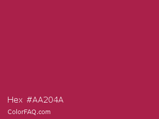 Hex #aa204a Color is a normal rose color and the nearest color is French Wine #ac1e44. Hex code #aa204a and RGB value is rgb(170,32,74). In RGB color space, this color is composed of 67% red, 13% green, 29% blue, In CMYK color space, this color is composed of 0% cyan, 81% magenta, 56% yellow , 33% black , In HSL color space, this color has a hue angle of 342° , 68% saturation and 40% lightness.
