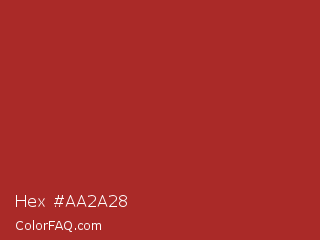 Hex #aa2a28 Color is a normal red color and the nearest color is Red Brown #a52a2a. Hex code #aa2a28 and RGB value is rgb(170,42,40). In RGB color space, this color is composed of 67% red, 16% green, 16% blue, In CMYK color space, this color is composed of 0% cyan, 75% magenta, 76% yellow , 33% black , In HSL color space, this color has a hue angle of 1° , 62% saturation and 41% lightness.