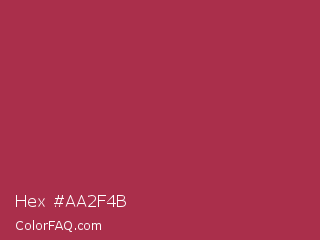 Hex #aa2f4b Color is a normal red color and the nearest color is Amaranth Purple #ab274f. Hex code #aa2f4b and RGB value is rgb(170,47,75). In RGB color space, this color is composed of 67% red, 18% green, 29% blue, In CMYK color space, this color is composed of 0% cyan, 72% magenta, 56% yellow , 33% black , In HSL color space, this color has a hue angle of 346° , 57% saturation and 43% lightness.