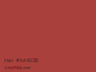 Hex #aa403b Color is a normal red color and the nearest color is Medium Carmine #af4035. Hex code #aa403b and RGB value is rgb(170,64,59). In RGB color space, this color is composed of 67% red, 25% green, 23% blue, In CMYK color space, this color is composed of 0% cyan, 62% magenta, 65% yellow , 33% black , In HSL color space, this color has a hue angle of 3° , 48% saturation and 45% lightness.