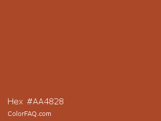 Hex #aa4828 Color is a normal color and the nearest color is Paarl #a65529. Hex code #aa4828 and RGB value is rgb(170,72,40). In RGB color space, this color is composed of 67% red, 28% green, 16% blue, In CMYK color space, this color is composed of 0% cyan, 58% magenta, 76% yellow , 33% black , In HSL color space, this color has a hue angle of 15° , 62% saturation and 41% lightness.
