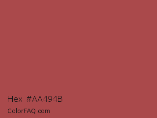 Hex #aa494b Color is a normal red color and the nearest color is English Red #ab4b52. Hex code #aa494b and RGB value is rgb(170,73,75). In RGB color space, this color is composed of 67% red, 29% green, 29% blue, In CMYK color space, this color is composed of 0% cyan, 57% magenta, 56% yellow , 33% black , In HSL color space, this color has a hue angle of 359° , 40% saturation and 48% lightness.