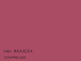 Hex #aa4c64 Color is a normal red color and the nearest color is Cadillac #b04c6a. Hex code #aa4c64 and RGB value is rgb(170,76,100). In RGB color space, this color is composed of 67% red, 30% green, 39% blue, In CMYK color space, this color is composed of 0% cyan, 55% magenta, 41% yellow , 33% black , In HSL color space, this color has a hue angle of 345° , 38% saturation and 48% lightness.