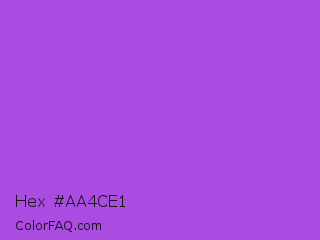 Hex #aa4ce1 Color is a normal purple color and the nearest color is Medium Orchid #ba55d3. Hex code #aa4ce1 and RGB value is rgb(170,76,225). In RGB color space, this color is composed of 67% red, 30% green, 88% blue, In CMYK color space, this color is composed of 24% cyan, 66% magenta, 0% yellow , 12% black , In HSL color space, this color has a hue angle of 278° , 71% saturation and 59% lightness.
