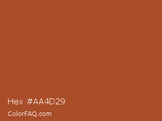 Hex #aa4d29 Color is a normal orange color and the nearest color is Paarl #a65529. Hex code #aa4d29 and RGB value is rgb(170,77,41). In RGB color space, this color is composed of 67% red, 30% green, 16% blue, In CMYK color space, this color is composed of 0% cyan, 55% magenta, 76% yellow , 33% black , In HSL color space, this color has a hue angle of 17° , 61% saturation and 41% lightness.