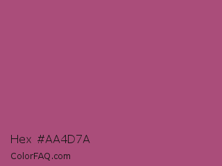 Hex #aa4d7a Color is a normal rose color and the nearest color is Mystic Maroon #ad4379. Hex code #aa4d7a and RGB value is rgb(170,77,122). In RGB color space, this color is composed of 67% red, 30% green, 48% blue, In CMYK color space, this color is composed of 0% cyan, 55% magenta, 28% yellow , 33% black , In HSL color space, this color has a hue angle of 331° , 38% saturation and 48% lightness.