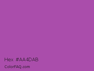 Hex #aa4dab Color is a normal magenta color and the nearest color is Purpureus #9a4eae. Hex code #aa4dab and RGB value is rgb(170,77,171). In RGB color space, this color is composed of 67% red, 30% green, 67% blue, In CMYK color space, this color is composed of 1% cyan, 55% magenta, 0% yellow , 33% black , In HSL color space, this color has a hue angle of 299° , 38% saturation and 49% lightness.
