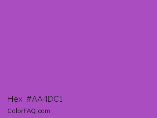 Hex #aa4dc1 Color is a normal purple color and the nearest color is Purple Plum #9c51b6. Hex code #aa4dc1 and RGB value is rgb(170,77,193). In RGB color space, this color is composed of 67% red, 30% green, 76% blue, In CMYK color space, this color is composed of 12% cyan, 60% magenta, 0% yellow , 24% black , In HSL color space, this color has a hue angle of 288° , 48% saturation and 53% lightness.