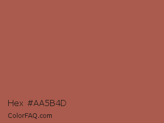 Hex #aa5b4d Color is a normal red color and the nearest color is Redwood #a45a52. Hex code #aa5b4d and RGB value is rgb(170,91,77). In RGB color space, this color is composed of 67% red, 36% green, 30% blue, In CMYK color space, this color is composed of 0% cyan, 46% magenta, 55% yellow , 33% black , In HSL color space, this color has a hue angle of 9° , 38% saturation and 48% lightness.