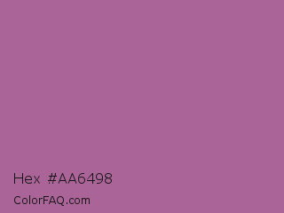 Hex #aa6498 Color is a normal magenta color and the nearest color is Pearly Purple #b768a2. Hex code #aa6498 and RGB value is rgb(170,100,152). In RGB color space, this color is composed of 67% red, 39% green, 60% blue, In CMYK color space, this color is composed of 0% cyan, 41% magenta, 11% yellow , 33% black , In HSL color space, this color has a hue angle of 315° , 29% saturation and 53% lightness.