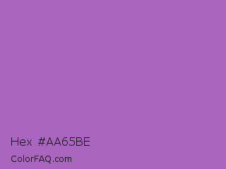 Hex #aa65be Color is a normal purple color and the nearest color is Rich Lavender #a76bcf. Hex code #aa65be and RGB value is rgb(170,101,190). In RGB color space, this color is composed of 67% red, 40% green, 75% blue, In CMYK color space, this color is composed of 11% cyan, 47% magenta, 0% yellow , 25% black , In HSL color space, this color has a hue angle of 287° , 41% saturation and 57% lightness.