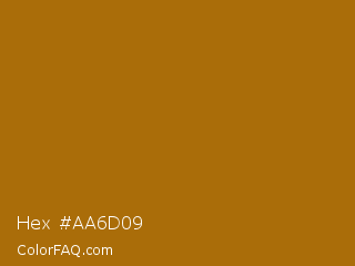 Hex #aa6d09 Color is a normal orange color and the nearest color is Mai Tai #b06608. Hex code #aa6d09 and RGB value is rgb(170,109,9). In RGB color space, this color is composed of 67% red, 43% green, 4% blue, In CMYK color space, this color is composed of 0% cyan, 36% magenta, 95% yellow , 33% black , In HSL color space, this color has a hue angle of 37° , 90% saturation and 35% lightness.