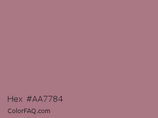 Hex #aa7784 Color is a normal red color and the nearest color is Turkish Rose #b57281. Hex code #aa7784 and RGB value is rgb(170,119,132). In RGB color space, this color is composed of 67% red, 47% green, 52% blue, In CMYK color space, this color is composed of 0% cyan, 30% magenta, 22% yellow , 33% black , In HSL color space, this color has a hue angle of 345° , 23% saturation and 57% lightness.