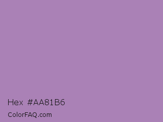 Hex #aa81b6 Color is a light purple color and the nearest color is African Violet #b284be. Hex code #aa81b6 and RGB value is rgb(170,129,182). In RGB color space, this color is composed of 67% red, 51% green, 71% blue, In CMYK color space, this color is composed of 7% cyan, 29% magenta, 0% yellow , 29% black , In HSL color space, this color has a hue angle of 286° , 27% saturation and 61% lightness.