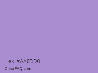 Hex #aa8dd0 Color is a light violet color and the nearest color is East Side #ac91ce. Hex code #aa8dd0 and RGB value is rgb(170,141,208). In RGB color space, this color is composed of 67% red, 55% green, 82% blue, In CMYK color space, this color is composed of 18% cyan, 32% magenta, 0% yellow , 18% black , In HSL color space, this color has a hue angle of 266° , 42% saturation and 68% lightness.