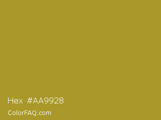 Hex #aa9928 Color is a normal yellow color and the nearest color is Lemon Ginger #ac9e22. Hex code #aa9928 and RGB value is rgb(170,153,40). In RGB color space, this color is composed of 67% red, 60% green, 16% blue, In CMYK color space, this color is composed of 0% cyan, 10% magenta, 76% yellow , 33% black , In HSL color space, this color has a hue angle of 52° , 62% saturation and 41% lightness.