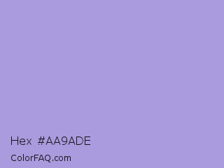 Hex #aa9ade Color is a light indigo color and the nearest color is Cold Purple #aba0d9. Hex code #aa9ade and RGB value is rgb(170,154,222). In RGB color space, this color is composed of 67% red, 60% green, 87% blue, In CMYK color space, this color is composed of 23% cyan, 31% magenta, 0% yellow , 13% black , In HSL color space, this color has a hue angle of 254° , 51% saturation and 74% lightness.