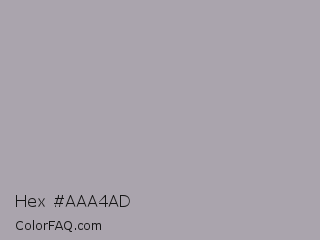 Hex #aaa4ad Color is a light purple color and the nearest color is Shady Lady #aaa5a9. Hex code #aaa4ad and RGB value is rgb(170,164,173). In RGB color space, this color is composed of 67% red, 64% green, 68% blue, In CMYK color space, this color is composed of 2% cyan, 5% magenta, 0% yellow , 32% black , In HSL color space, this color has a hue angle of 280° , 5% saturation and 66% lightness.