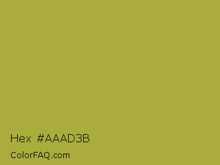 Hex #aaad3b Color is a normal yellow color and the nearest color is Brass #b5a642. Hex code #aaad3b and RGB value is rgb(170,173,59). In RGB color space, this color is composed of 67% red, 68% green, 23% blue, In CMYK color space, this color is composed of 2% cyan, 0% magenta, 66% yellow , 32% black , In HSL color space, this color has a hue angle of 62° , 49% saturation and 45% lightness.