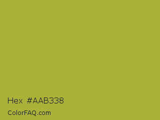 Hex #aab338 Color is a normal yellow color and the nearest color is Brass #b5a642. Hex code #aab338 and RGB value is rgb(170,179,56). In RGB color space, this color is composed of 67% red, 70% green, 22% blue, In CMYK color space, this color is composed of 5% cyan, 0% magenta, 69% yellow , 30% black , In HSL color space, this color has a hue angle of 64° , 52% saturation and 46% lightness.