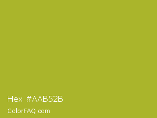 Hex #aab52b Color is a normal yellow color and the nearest color is Citron #9fa91f. Hex code #aab52b and RGB value is rgb(170,181,43). In RGB color space, this color is composed of 67% red, 71% green, 17% blue, In CMYK color space, this color is composed of 6% cyan, 0% magenta, 76% yellow , 29% black , In HSL color space, this color has a hue angle of 65° , 62% saturation and 44% lightness.
